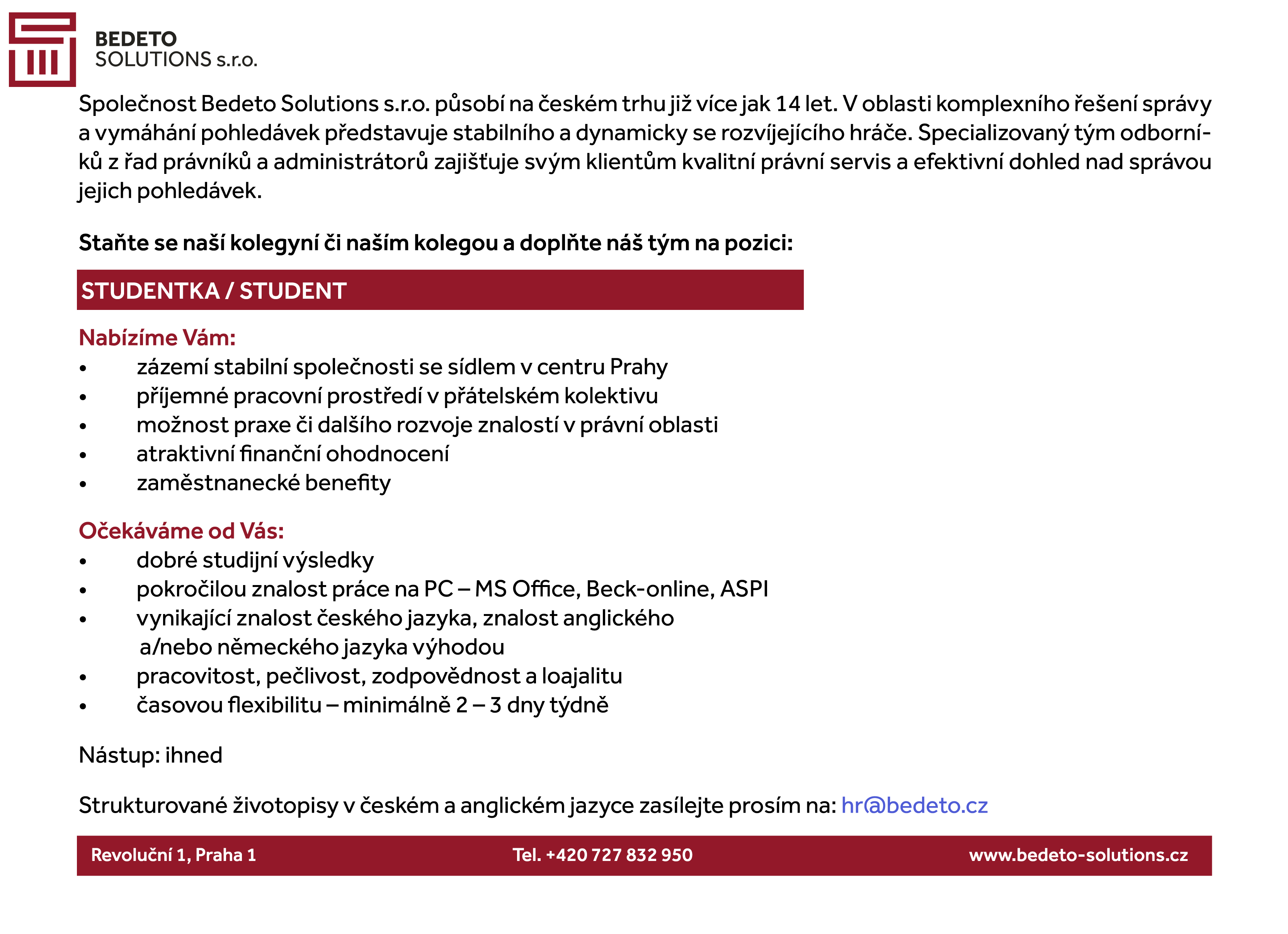 V případě Vašeho zájmu zasílejte prosím Vaše strukturované životopisy v českém a anglickém jazyce na: hr@bedeto.cz